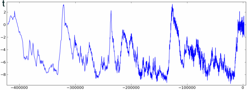 This graph illustrates the temperature during the most recent glaciation cycles: